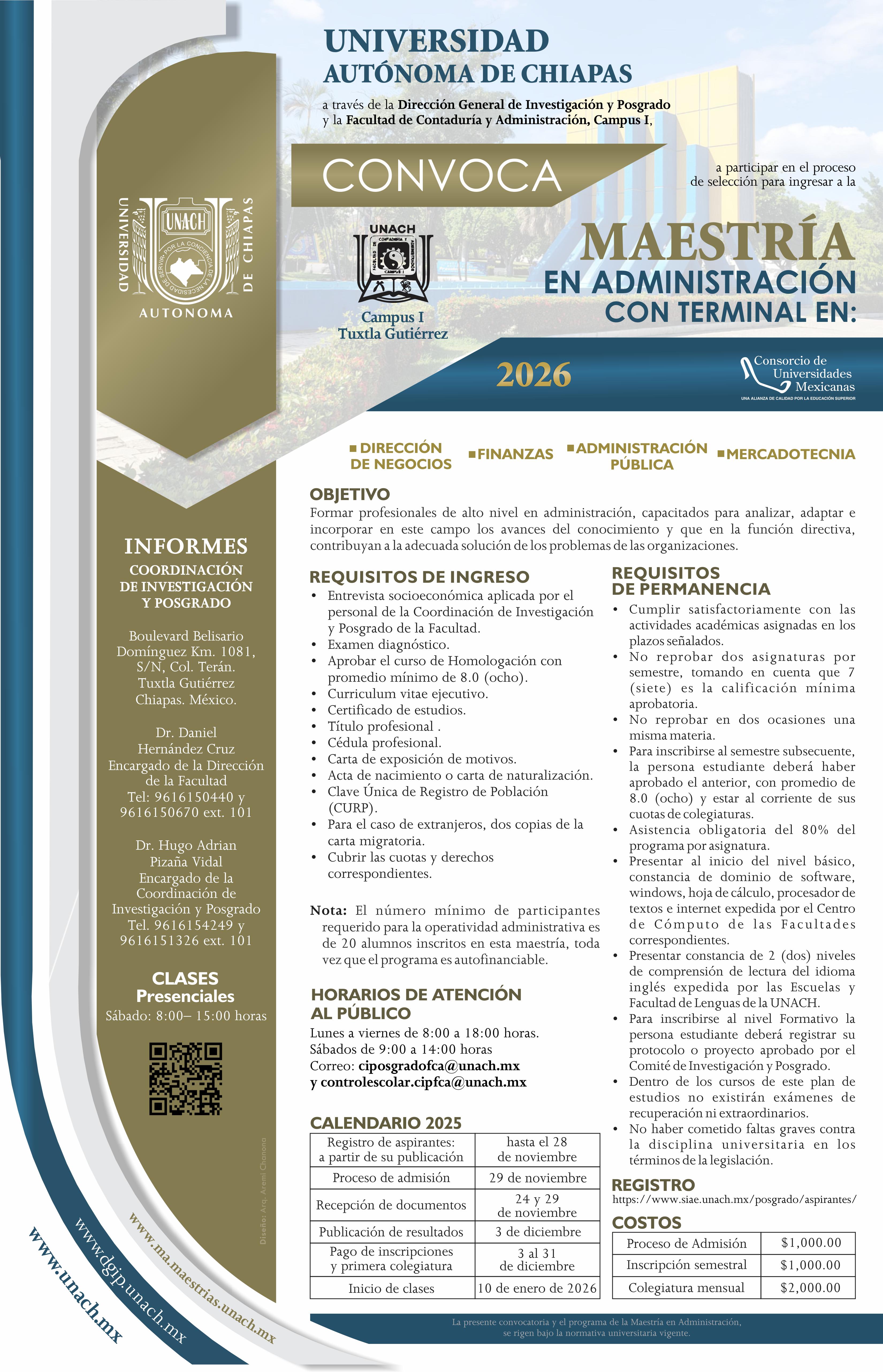 MAESTRÍA EN ADMINISTRACIÓN. REGISTRO DE ASPIRANTES HASTA EL 28 DE NOVIEMBRE DE 2025. CAMPUS I, TUXTLA GUTIERREZ