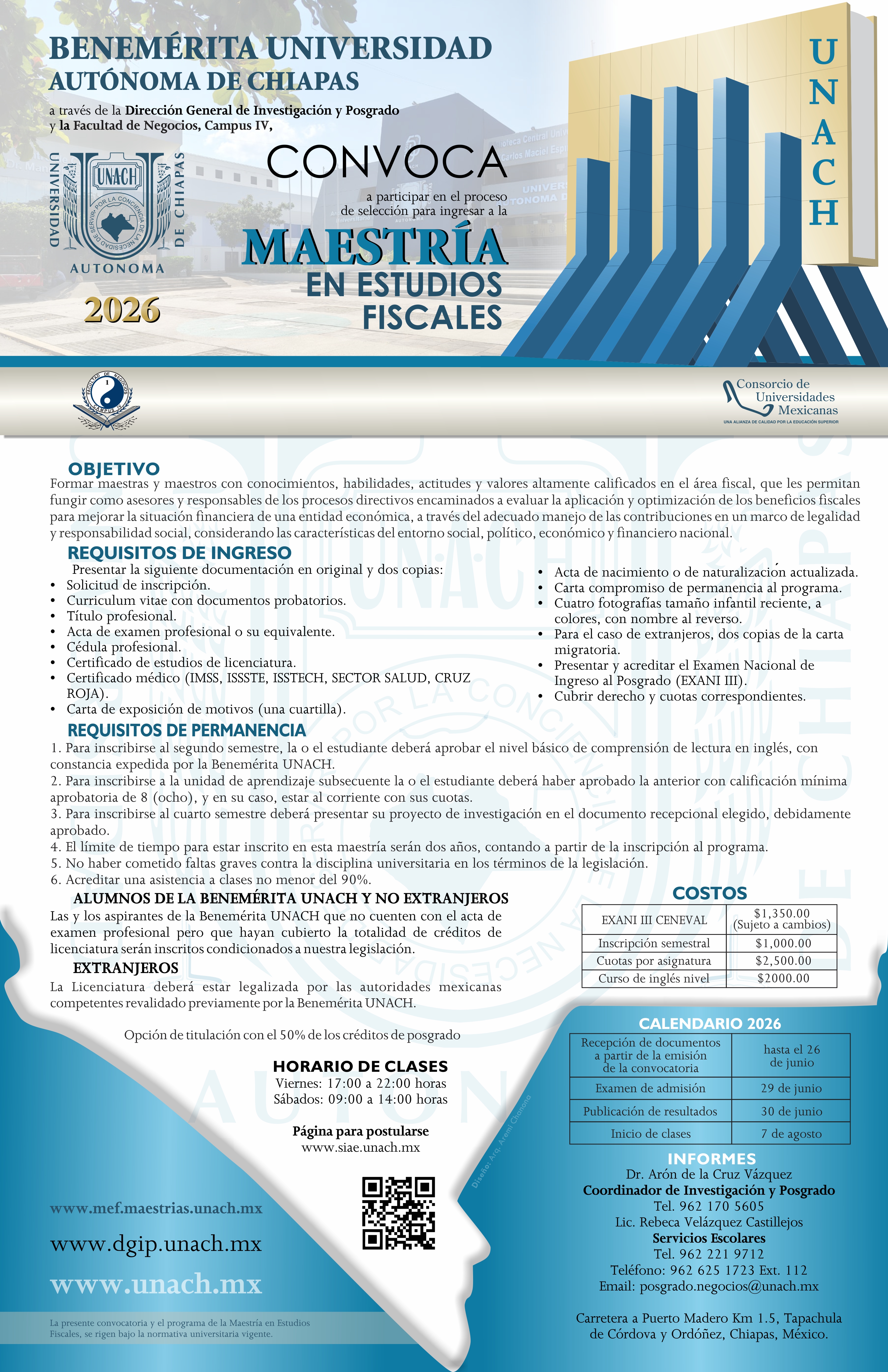 CONVOCATORIA, MAESTRÍA EN ESTUDIOS FISCALES C-IV TAPACHULA. RECEPCIÓN DE DOCUMENTOS: HASTA EL 26 DE JUNIO DE 2026