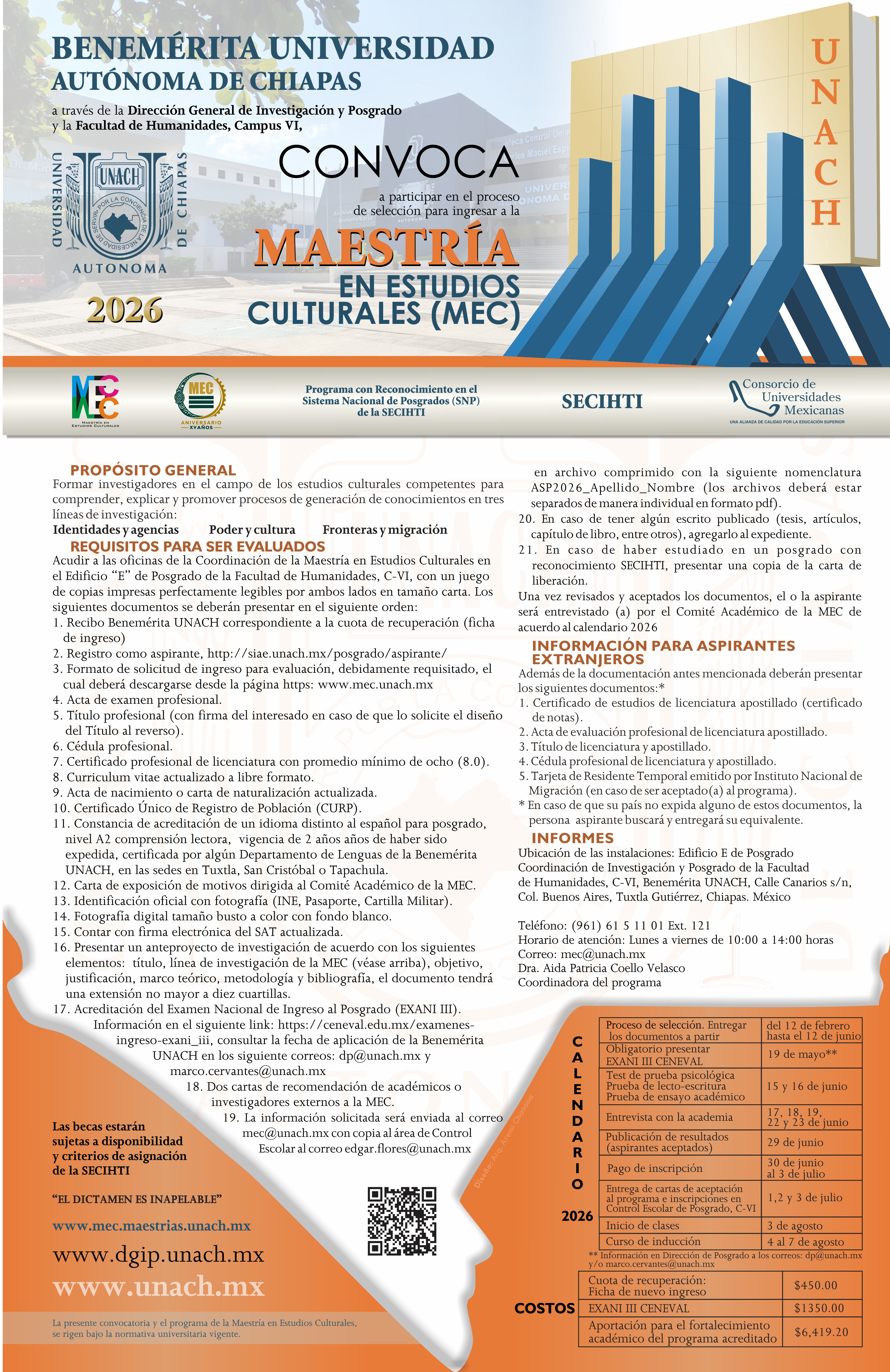 CONVOCATORIA MAESTRÍA EN ESTUDIOS CULTURALES. ENTREGAR DOCUMENTOS A PARTIR DEL 12 DE FEBRERO HASTA EL 12 DE JUNIO DE 2026